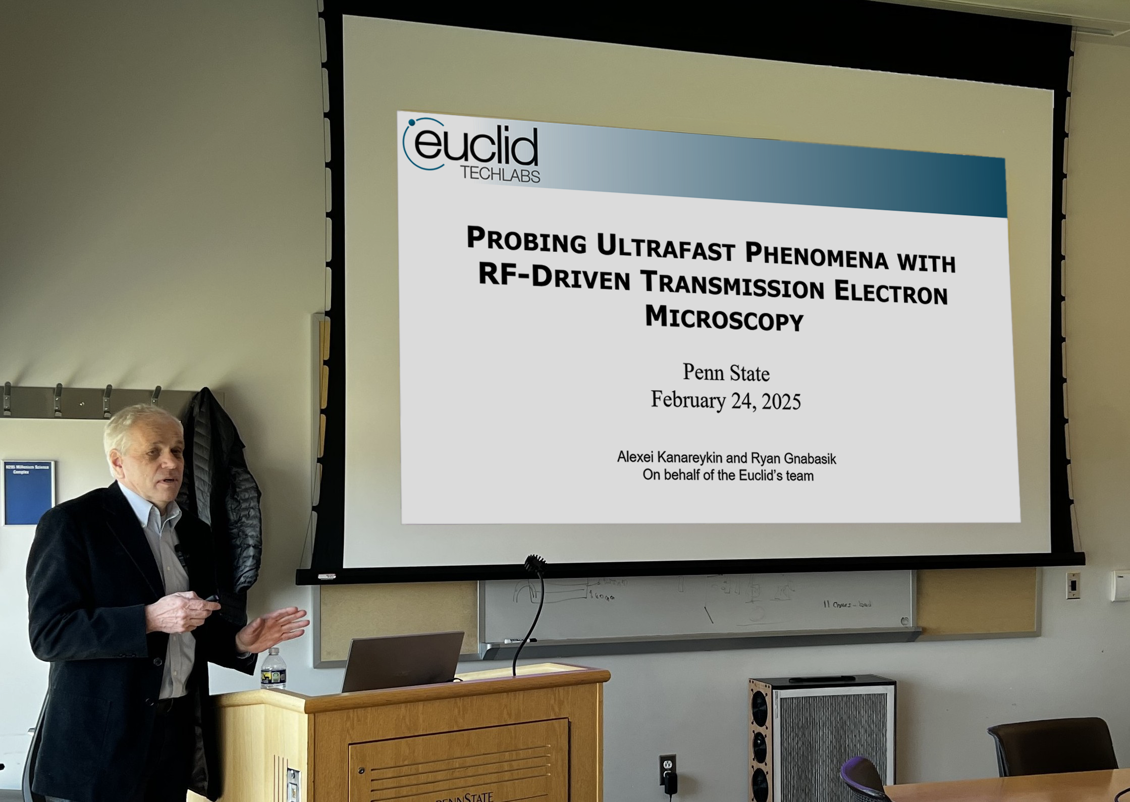 Euclid’s Alexei Kanareykin and Ryan Gnabasik delivered a seminar titled, “Probing Ultrafast Phenomena with RF-Driven Transmission Electron Microscopy” on Monday, February 24th to students and faculty at Penn State’s Material Research Institute (MRI). The talk covered Euclid’s history and then focused in on the development and working principles of our UltraFast Pulser™ system. In addition, Euclid showcased research from our collaborators at NIST and BNL including a new study on the dynamics of spin-wave formation and propagation in permalloy1.